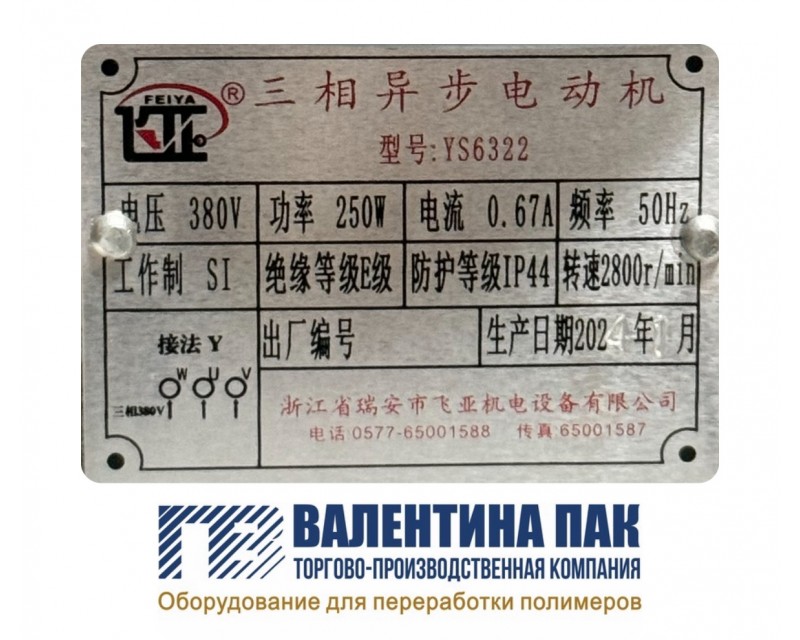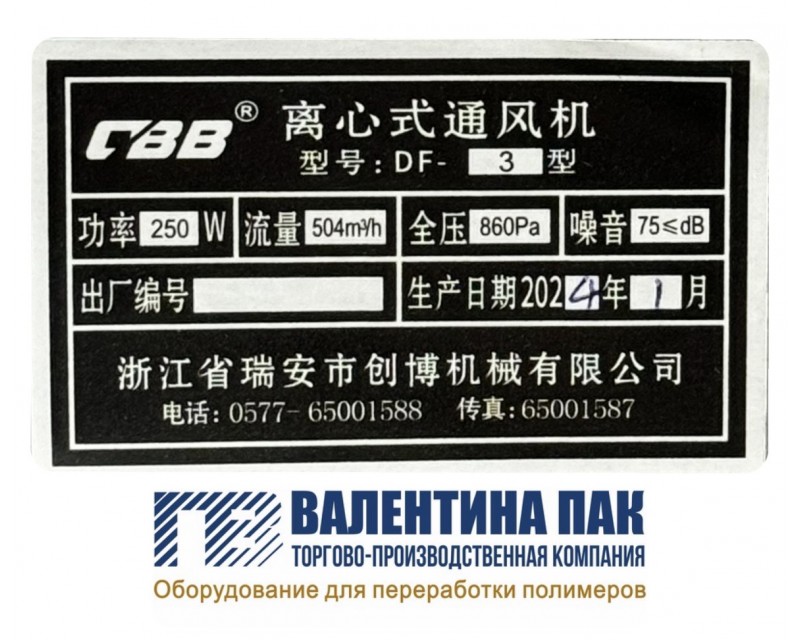 * Мощность - 250 W, напряжение питания- 380V, скорость вращения- 2 800 r/min., максимальный ток- 0,67А, давление потока - 860 Pa.